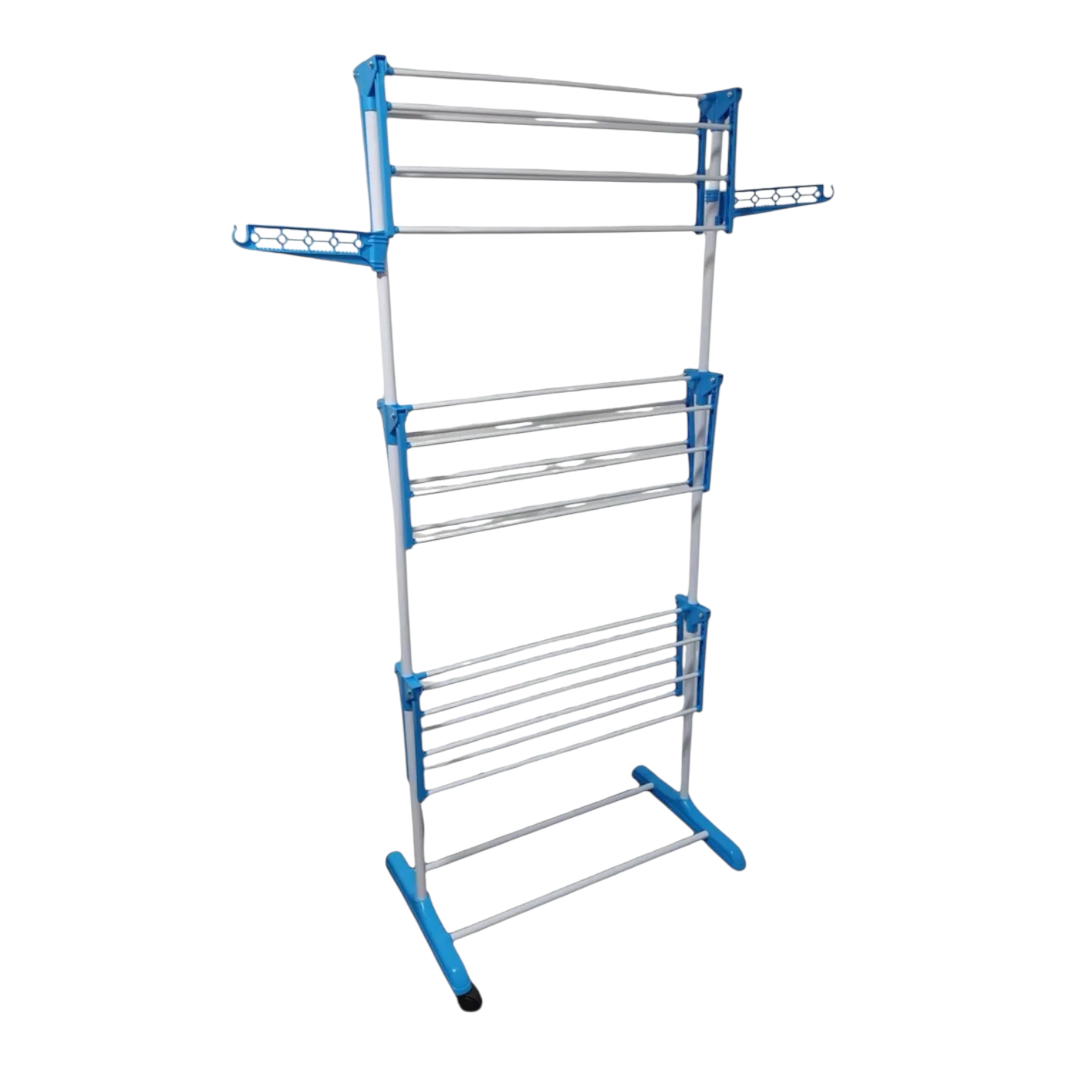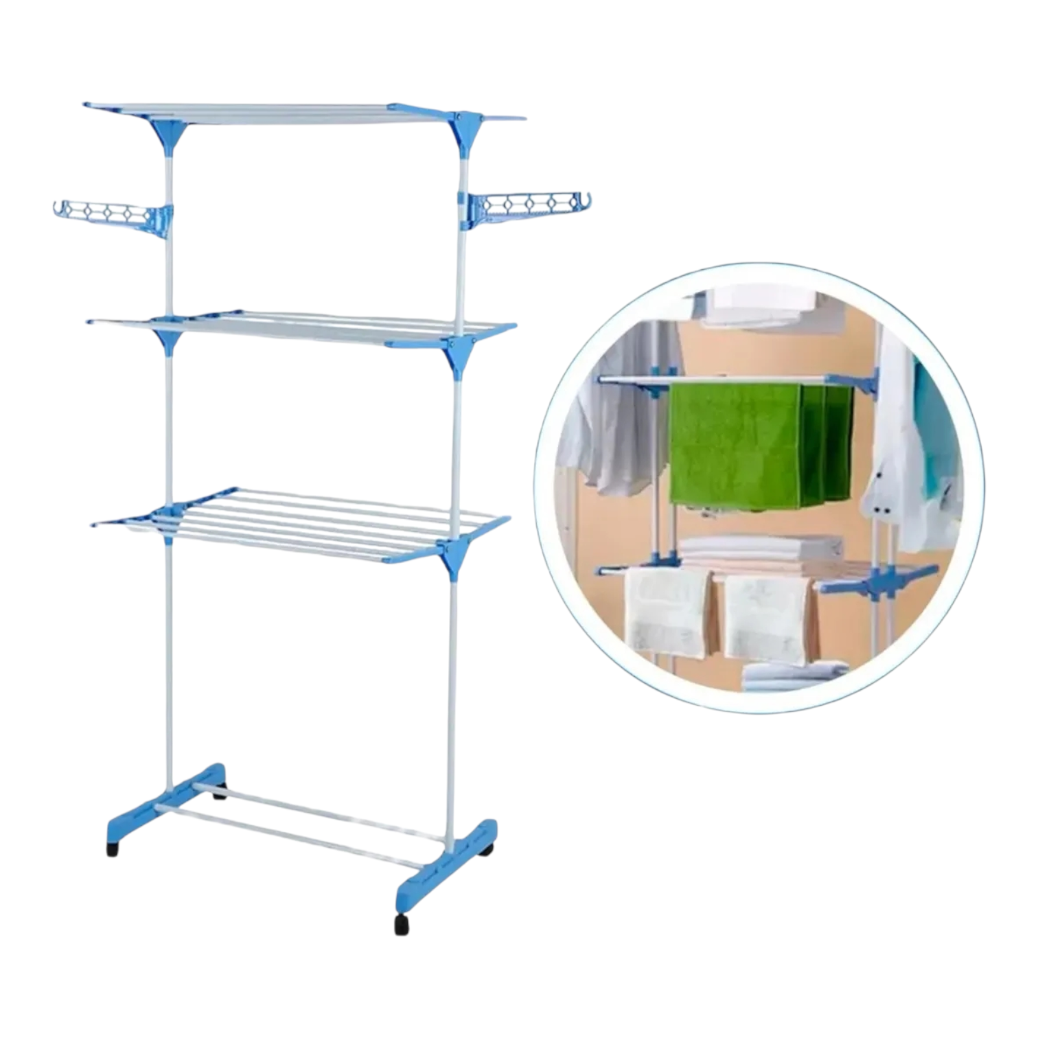 TENDER VERTICAL CON ALAS – Producto ideal para colgar ropa luego del lavado tanto en exteriores como interiores y lugares pequeños. – Posee ruedas, lo que hace que el producto sea muy cómodo y práctico a la hora de trasladar. – Cuenta con dos ganchos móviles para colgar la ropa en perchas y lograr un secado sin arrugas. – Se pliega fácilmente para guardarlo y ahorrar espacio cuando no se utiliza. CARACTERISTICAS: • Medidas: Alto: 170 cm x Ancho 75 cm x Profundo 69 cm • Medidas plegado: 75 cm ancho x 170 cm alto x 50 cm profundo. • Material: Acero pintado con pintura antioxidante y plástico reforzado en las uniones • Soporta hasta 40 kg • Incluye: – 2 ménsulas para colgar perchas. – 3 estantes dobles (en total 21 varillas). – 4 ruedas.