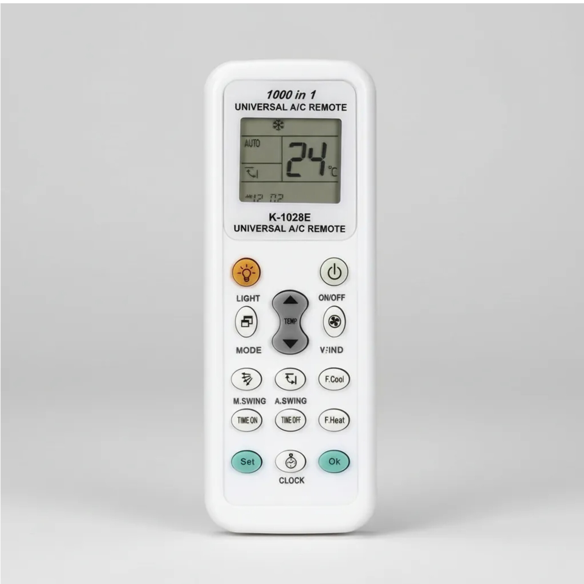 * CONFIGURACION AUTOMATICA: 1) Enchufar el Aire Acondicionado. 2) Apuntar con el Control Remoto al Aire mientras mantenes apretado SET durante 5″ 3) Solta y Volve a presionar una vez el botón SET siempre mientras apuntas al equipo. 4) En pantalla empezarán a aparecer códigos de 3 números que irán subiendo hasta que el control remoto emita un sonido, se prenda o apague y presionar el botón OK. 5) El control remoto ya quedó configurado con tu aire acondicionado. 6) Si hay funciones del control remoto que no responden en el Aire, podes repetir los pasos anteriores y encontrar otro codigo y probar ya que un mismo equipo puede tener hasta 3 códigos diferentes compatibles.