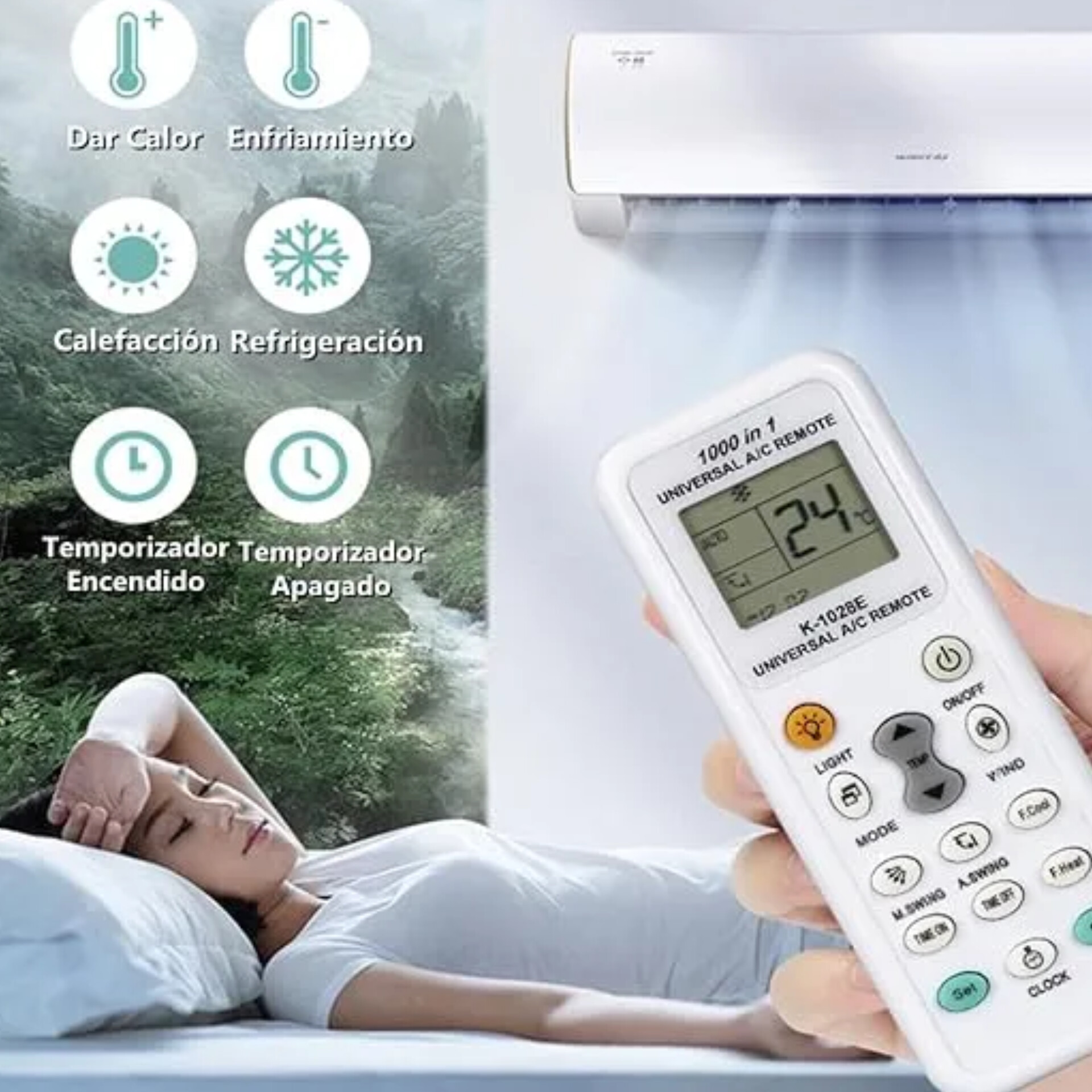 CONTROL REMOTO UNIVERSAL PARA AIRE ACONDICIONADO: * Configura Encendido / Apagado, Temperatura, Frío / Calor, Modos de Ventilación, Movimiento de Paletas, Timer, etc. * Pantalla Led de Fácil Lectura. * Funciona con 2 pilas AAA (NO incluídas). * Medidas: 13.2cm (alto) x 5cm (ancho) x 2cm (profundidad). * Las Marcas que aparecen en el manual son Internacionales, puede que la de tu equipo no este en la lista pero tiene un código compatible con alguna marca y modelo.